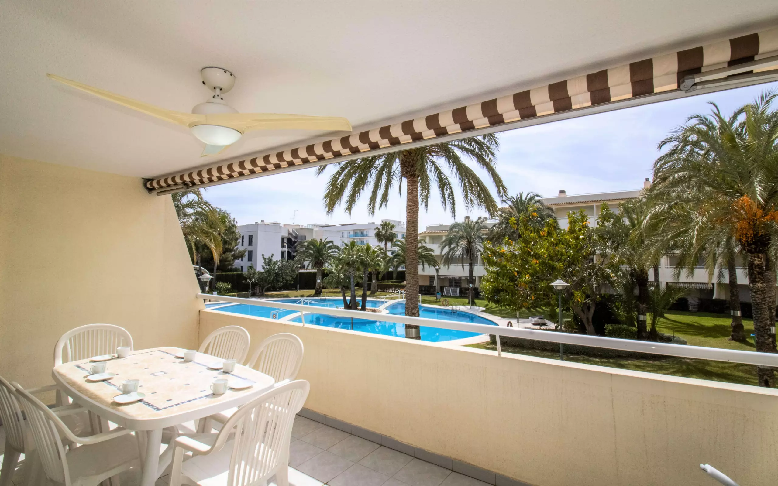 Enfin, une grande terrasse avec de belles vues sur la piscine commune, ainsi que sur les beaux jardins et palmiers de l'urbanisation.